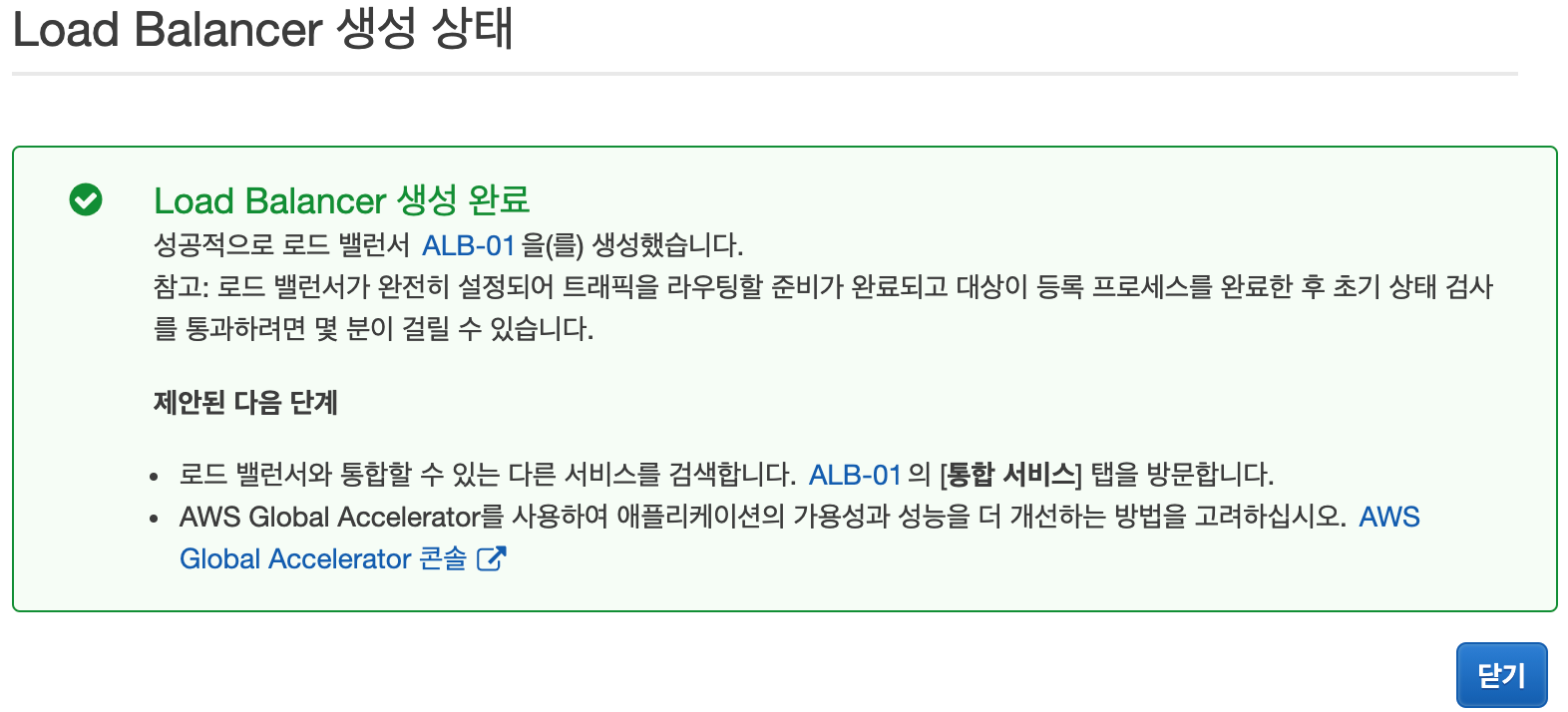 9. 설정을 검토 한 뒤 로드 밸런서를 생성합니다. 로드 밸런서는 생성 후 상태 확인을 실행 한 뒤 몇 분 내로 실행되어야 합니다.