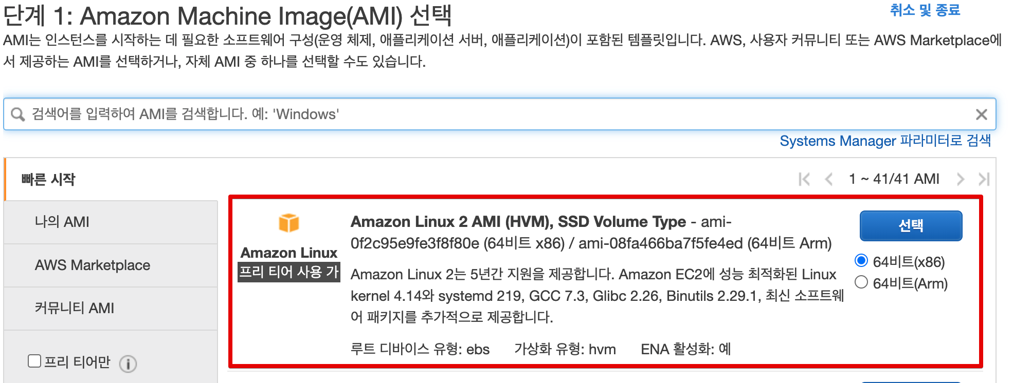 2. 빠른 시작 섹션에서 Amazon Linux 2 AMI를 선택합니다.