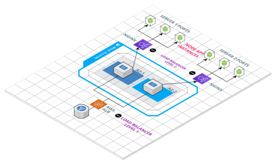 이것이 우리가 목표로 하는 아키텍처입니다. AWS와 NGINX에서 관리하는 다중 로드 밸런서는 node 앱을 위한 EC2 인스턴스에서 여러 포트를 관리하는데 도움이 됩니다. 이 아키텍처의 장점은 두 인스턴스가 AZ1과 AZ2의 서로 다른 가용 영역을 가진다는 것입니다. 이로 인해 한 영역이 다운되더라도 다른 영역은 계속 동작할 것이며 두 애플리케이션은 충돌하지 않게 됩니다.