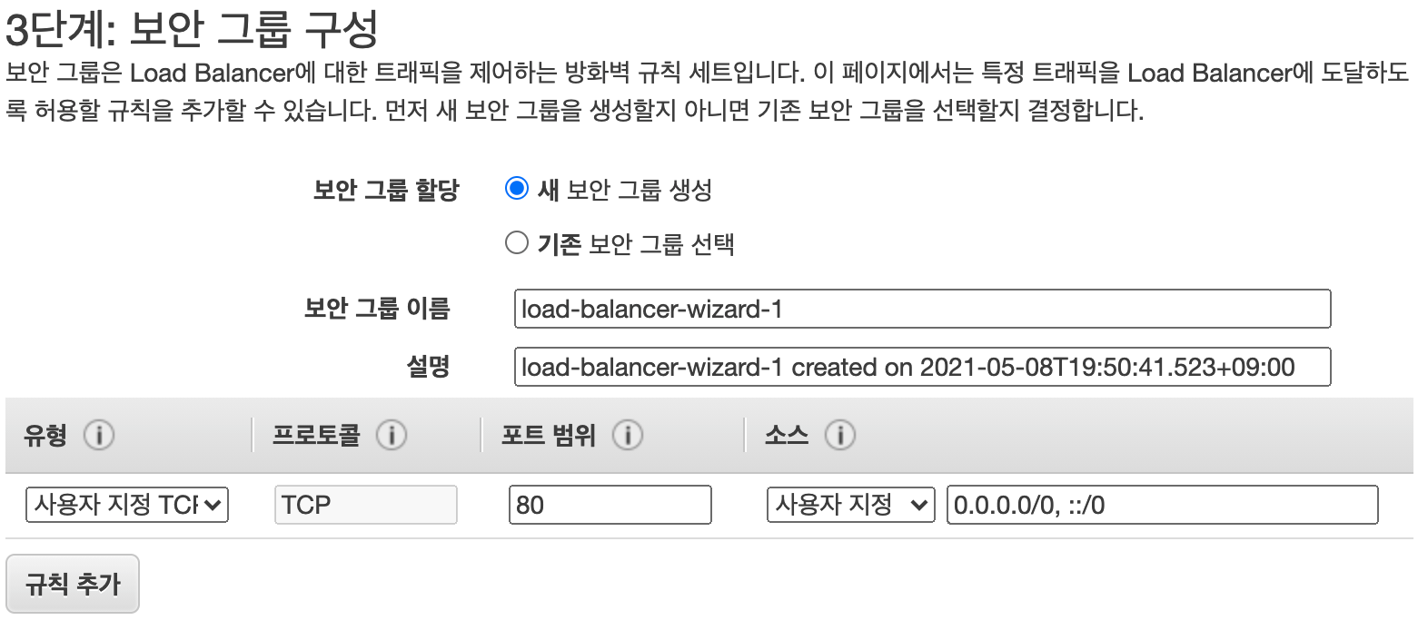 7. 보안 그룹 구성으로 이동해 모든 IP에 대해 80번 포트가 열려있는 새 보안 그룹을 만들고 다음을 클릭합니다.