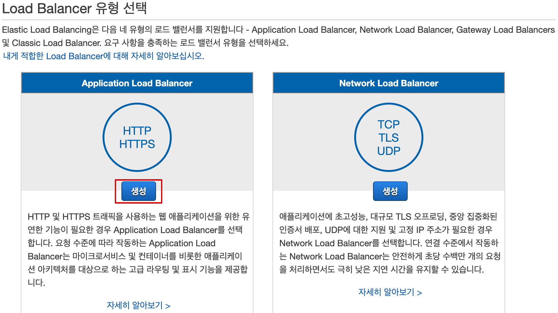 5. 이제 로드 밸런서로 이동해 로드 밸런서 생성 버튼을 클릭한 뒤 Application Load Balancer 생성을 클릭합니다.