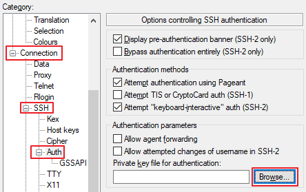 좌측 Cetegory에서 Connection -> SSH -> Auth로 이동합니다. Authentication parameters의 Private key file for authentication에 있는 Browse 버튼을 클릭해 생성한 .ppk 파일을 불러옵니다.