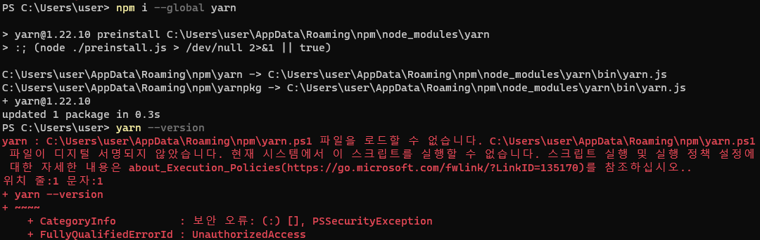 이후 설치 확인을 위해 yarn 명령을 수행하려 하면 보안 오류가 발생합니다.