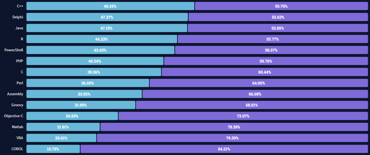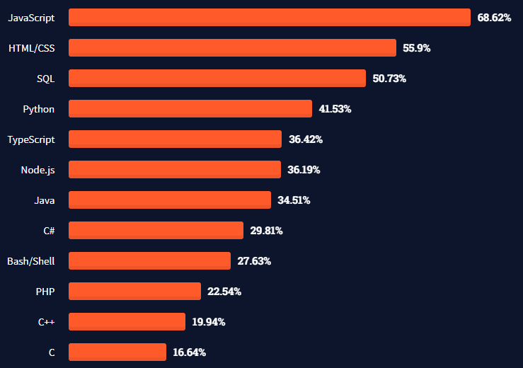인기 있는 언어와는 또 다른 결과가 나왔습니다. 가장 인기 있던 JS는 중위권에 그쳤으며 TS는 오히려 상위권으로 올라섰습니다. Java 역시 인기투표와는 달리 오히려 C#, C++ 보다 하위권에 위치하였습니다.