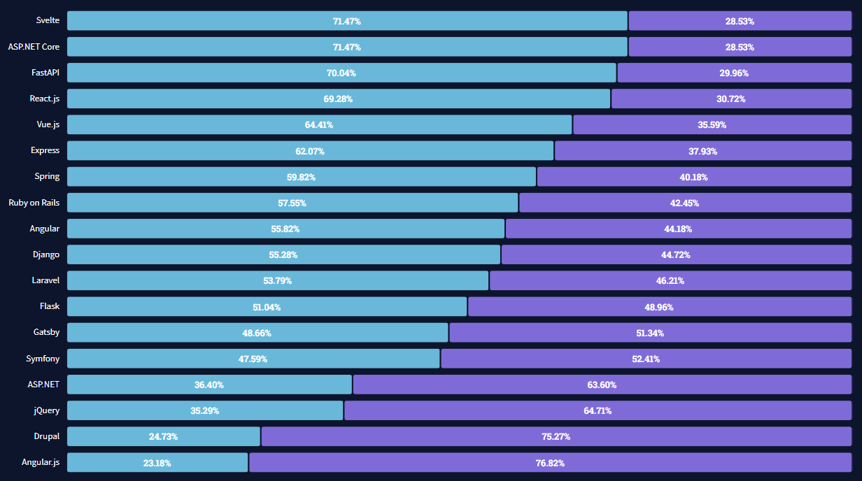 스벨트가 가히 압도적입니다. 등장한 지 얼마 되지 않았음에도 불구하고 1위를 차지했습니다. 그 뒤를 dotNet Core, React js, Vuejs가 따르고 있습니다. Angular는 아직 중위권을 유지하고 있습니다. 이제 jQuery와 AngularJs는 그만 놓아주어야 할 때인 것 같습니다.