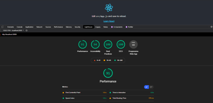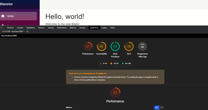 위 다이어 그램에서 Lighthouse 점수는 Blazor앱에 몇 가지 심각한 성능 문제가 있음을 보여줍니다. 초기 페이지 로드 시 필요한 종속성을 다운로드해야 하므로 초기 페이지 로드 시간이 느립니다.