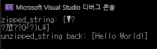 "Hello World!"를 GZIP 압축 및 압축 해제하는 코드입니다. 콘솔로 실행시키면 다음과 같이 정상 동작하는 것을 확인할 수 있습니다.