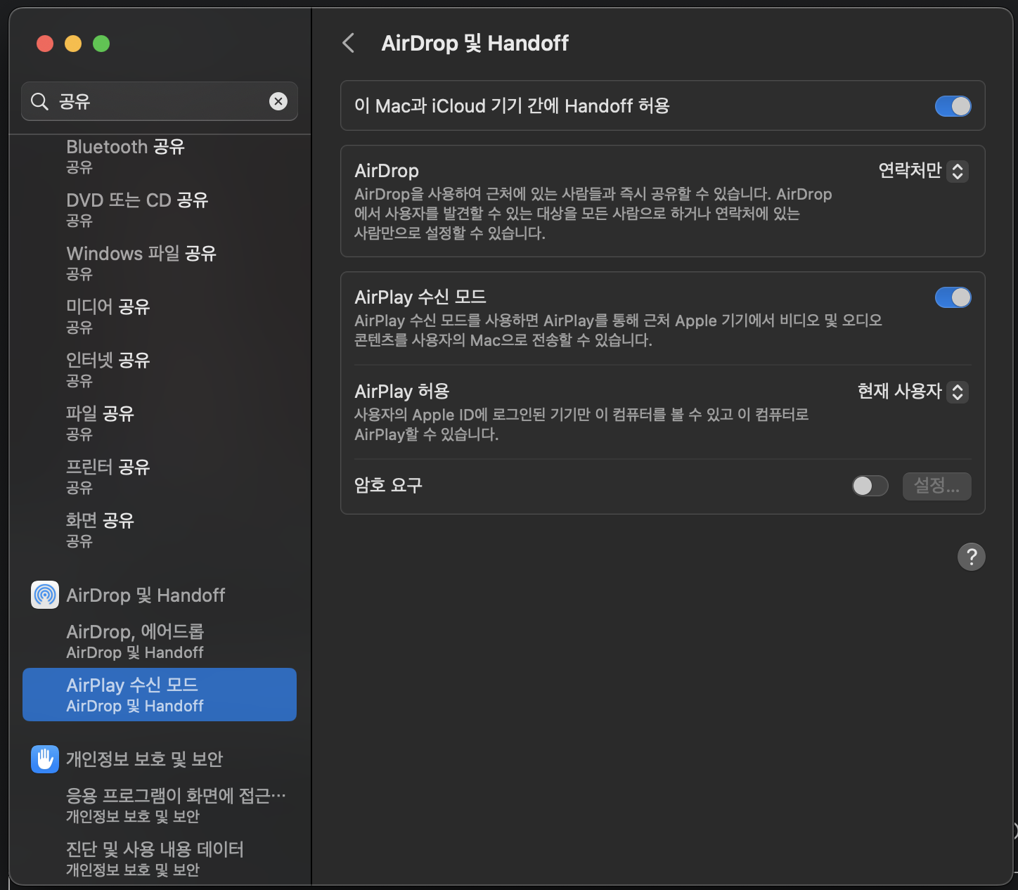 해당 설정에서 AirPlay 수신 모드를 꺼주면 이제 5000번 포트를 사용할 수 있습니다.