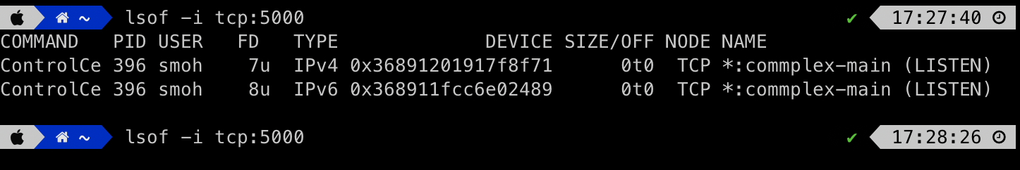 실제로 5000번 포트를 사용하고 있는 것을 확인해보니 "제어센터" 프로세프가 5000번 포트를 점유 중입니다.