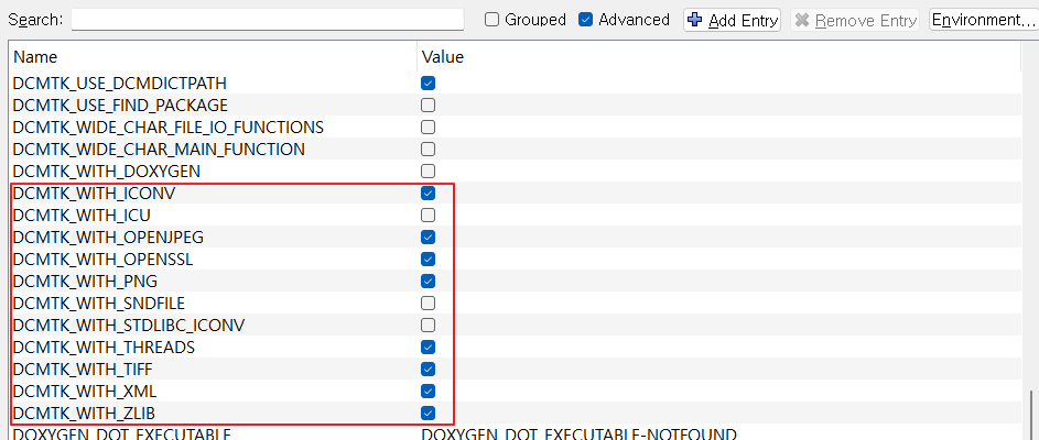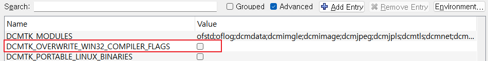 이와 함께 "DCMTK_OVERWRITE_WIN32_COMPILER_FLAGS"를 체크해제 합니다. 해당 옵션이 체크되어 있으면 기껏 바꾼 MD옵션이 무시됩니다.