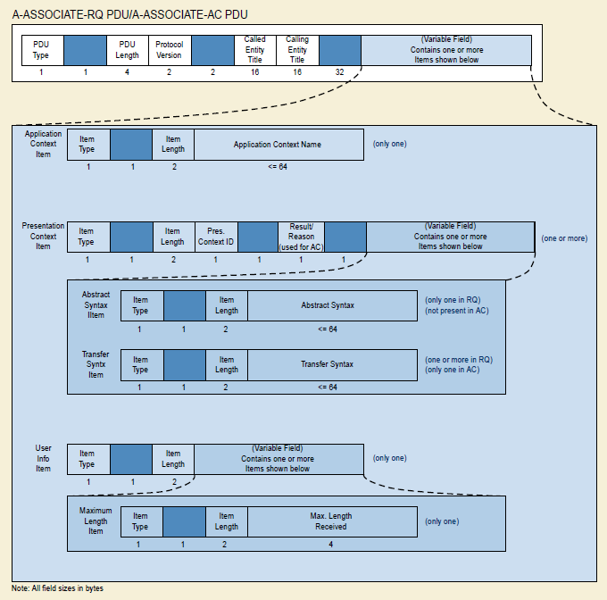 위의 그림은 DICOM UL 중 A-ASSOCIATE-RQ PDU와 A-ASSOCIATE-AC PDU의 PDU 인코딩의 예시입니다.