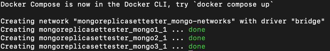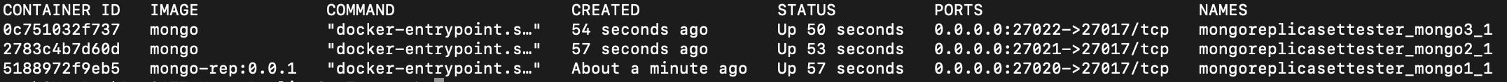세 컨테이너는 depends_on으로 연결되어 있으며 bridge 네트워크를 사용해 서로 서비스 이름을 통해 통신할 수 있습니다. 추가적으로 mongo2와 mongo3은 replSet 명령어로 "replication"이라는 이름으로 ReplicaSet을 생성합니다. 이 이름은 앞서 작성한 js의 _id에 입력한 값과 동일해야 합니다.