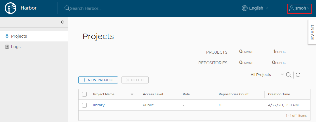 다크 모드로 보다 세련되어 보이게 변경되었습니다. 맘에 드네요. 그럼 기존 설치한 Harbor 1.10.2 버전을 2.0.0 버전으로 업그레이드해 보도록 하겠습니다.