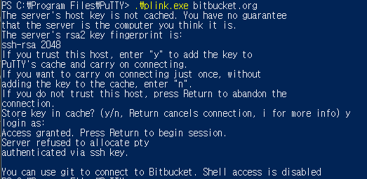 출력: 오류: The server's host key is not cached. You have no guarantee that the server is the computer you think it is. The server's rsa2 key fingerprint is: If you trust this host, enter "y" to add the key to PuTTY's cache and carry on connecting. If you want to carry on connecting just once, without adding the key to the cache, enter "n". If you do not trust this host, press Return to abandon the connection. Store key in cache? (y/n, Return cancels connection, i for more info) fatal: Could not read from remote repository.