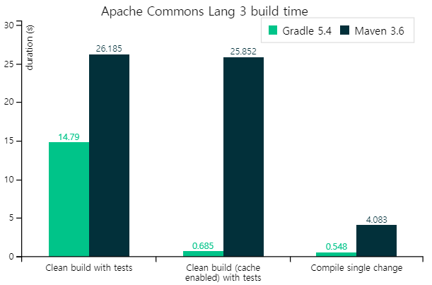 성능면에서도 많이 차이가 납니다. 클린 상태에서 빌드도 거의 두배 가량 차이나고 심지어 캐싱된 상태에서는 최대 100배까지 차이가 납니다.